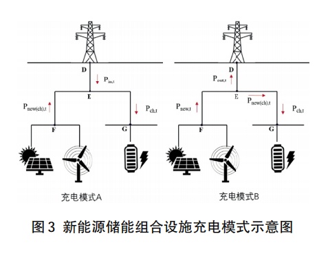 實(shí)際儲(chǔ)能的充電電量包含兩部分,一部分是新能源所發(fā)用于儲(chǔ)能充電的充電電量Qnew(ch),T,一部分是大電網(wǎng)下電用于儲(chǔ)能充電的充電電量Qin(ch),T,由圖3中的兩種充電模式下的電力流可以發(fā)現(xiàn),從大電網(wǎng)下電僅能用于儲(chǔ)能充電,即大電網(wǎng)下電功率Pin,t等于大電網(wǎng)下電用于儲(chǔ)能充電的功率Pin(ch),t,因此大電網(wǎng)下電用于儲(chǔ)能充電的充電電量就等于大電網(wǎng)下電電量Qin(ch),T=Qin,T。