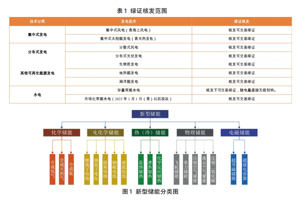 綠證作為可再生能源電力消費(fèi)憑證,用于可再生能源電力消費(fèi)量核算、可再生能源電力消費(fèi)認(rèn)證等,1個(gè)綠證對(duì)應(yīng)1000千瓦時(shí)可再生能源電量。國家發(fā)展改革委、財(cái)政部、國家能源局《關(guān)于做好可再生能源綠色電力證書全覆蓋工作 促進(jìn)可再生能源電力消費(fèi)的通知》(發(fā)改能源〔2023〕1044號(hào))明確,綠證是我國可再生能源電量環(huán)境屬性的唯一證明,是認(rèn)定可再生能源電力生產(chǎn)、消費(fèi)的唯一憑證。并規(guī)定如表1對(duì)全國風(fēng)電(含分散式風(fēng)電和海上風(fēng)電)、太陽能發(fā)電(含分布式光伏發(fā)電和光熱發(fā)電)、常規(guī)水電、生物質(zhì)發(fā)電、地?zé)崮馨l(fā)電、海洋能發(fā)電等已建檔立卡的可再生能源發(fā)電項(xiàng)目所生產(chǎn)的全部電量核發(fā)綠證,實(shí)現(xiàn)綠證核發(fā)全覆蓋,但并未對(duì)儲(chǔ)存新能源的儲(chǔ)能設(shè)施核發(fā)綠證作出具體規(guī)定說明。