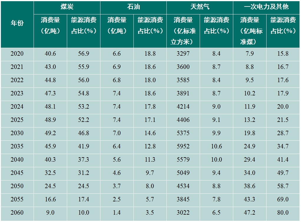 我國(guó)煤炭消費(fèi)預(yù)計(jì)在“十五五”前中期進(jìn)入49.5億~51億噸(國(guó)產(chǎn)原煤+進(jìn)口商品煤)的峰值平臺(tái)期,2030年略有回落至49億噸左右,“十六五”時(shí)期下降顯著,2035年降至46億噸以內(nèi),但仍占據(jù)能源消費(fèi)的主體地位(占比約42%)。2035年后,隨著非化石能源規(guī)?;l(fā)展,火電用煤逐步下降,同時(shí)各行業(yè)終端用能電氣化替代加速,煤炭消費(fèi)量將加速下降,到2050年降至24.5億噸左右,2060年進(jìn)一步降至8億~10億噸,占一次能源消費(fèi)的百分比較2024年下降43個(gè)百分點(diǎn),保持在10%左右。