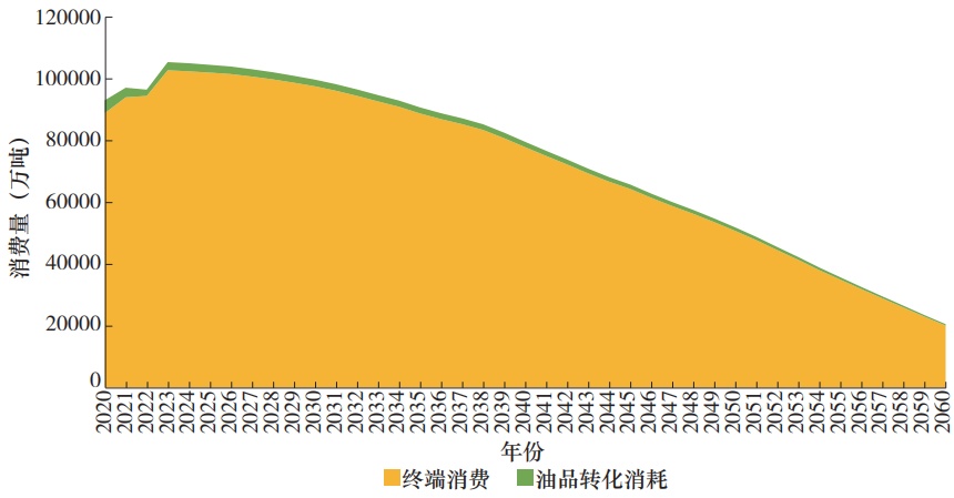 隨著新能源汽車對(duì)燃油汽車加速替代以及石油化工行業(yè)逐漸趨于飽和,石油消費(fèi)量將在當(dāng)前7.3億~7.5億噸(社會(huì)實(shí)際消費(fèi)量)的峰值平臺(tái)基礎(chǔ)上,逐步呈現(xiàn)穩(wěn)中有降態(tài)勢(shì),2030年、2035年分別降至約7.0億、6.4億噸,占一次能源消費(fèi)總量的百分比較2024年下降5個(gè)百分點(diǎn)至13%以下。2035年后,隨著能源消費(fèi)總量達(dá)峰后轉(zhuǎn)降、非化石能源替代加速,石油消費(fèi)量以年均減少近2000萬(wàn)噸的速度快速下降,到2050年、2060年分別降至3.7億、1.4億噸,2060年在一次能源消費(fèi)中占比約3.5%。