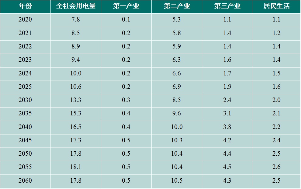 表2 全社會(huì)用電量及分產(chǎn)業(yè)用電量趨勢(shì)預(yù)測(cè)(單位:萬(wàn)億千瓦時(shí))