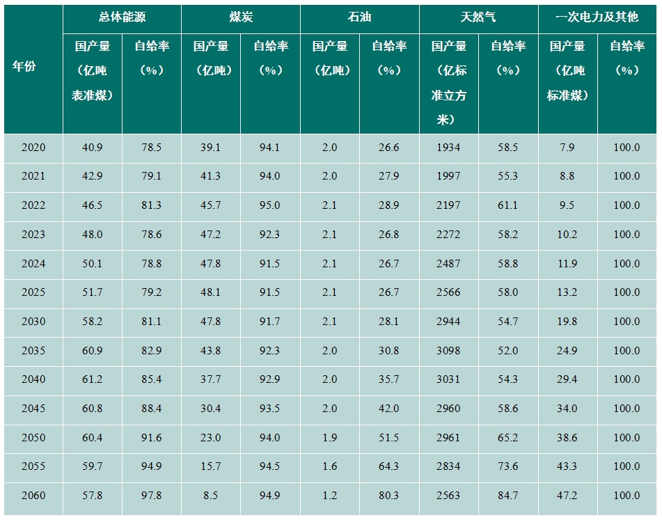 煤炭在助力非化石能源大規(guī)模高質(zhì)量發(fā)展過(guò)程中將發(fā)揮重要的兜底保障作用,煤炭產(chǎn)量將在“十五五”期間達(dá)到峰值(48億~49.5億噸)后保持較長(zhǎng)時(shí)間平臺(tái)期,2035年前保持在43億噸以上高位水平以兜住能源安全底線,到2045年降至30億~31億噸,2060年降至8億~9億噸。我國(guó)煤炭自給率始終保持在90%以上的高位水平,且不斷提升,預(yù)計(jì)到2060年達(dá)到95%左右。