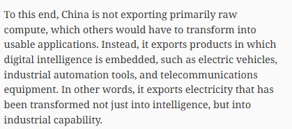 更值得注意的是,中國輸出的并不主要是單純的算力資源,而是已經(jīng)嵌入數(shù)字智能的工業(yè)產(chǎn)品,例如電動汽車、工業(yè)自動化設(shè)備和通信設(shè)備。換句話說,中國出口的不只是由電力轉(zhuǎn)化而來的智能能力,更是這種能力所支撐的工業(yè)競爭力。