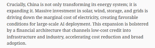 在作者看來,歐洲尤其值得關(guān)注的是中國擴(kuò)大能源供給能力的思路。文章指出,中國不僅在改造能源體系,也在持續(xù)擴(kuò)容能源體系本身。對太陽能、風(fēng)能、儲能和電網(wǎng)的大規(guī)模投資,正在不斷壓低電力邊際成本,并為大規(guī)模部署人工智能創(chuàng)造條件。與此同時,低成本信貸持續(xù)流向基礎(chǔ)設(shè)施和工業(yè)領(lǐng)域,也進(jìn)一步推動了成本下降和技術(shù)普及。