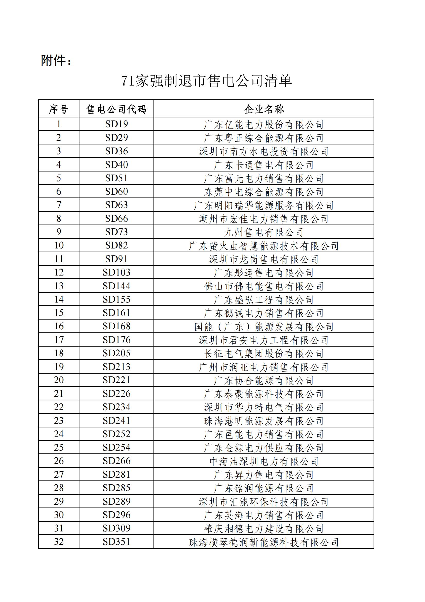 通知指出,2023年,廣東電力交易中心對(duì)廣東電力市場(chǎng)目錄內(nèi)所有售電公司開(kāi)展了持續(xù)滿足注冊(cè)條件的核查工作,對(duì)92家售電公司限期整改,截至2024年3月1日,仍有71家售電公司未持續(xù)滿足注冊(cè)條件且未在規(guī)定時(shí)間內(nèi)整改到位。經(jīng)請(qǐng)示廣東省能源局、國(guó)家能源局南方監(jiān)督管局批復(fù)同意,現(xiàn)對(duì)上述售電公司予以強(qiáng)制退出廣東電力市場(chǎng),并注銷其電力交易平臺(tái)賬號(hào)。