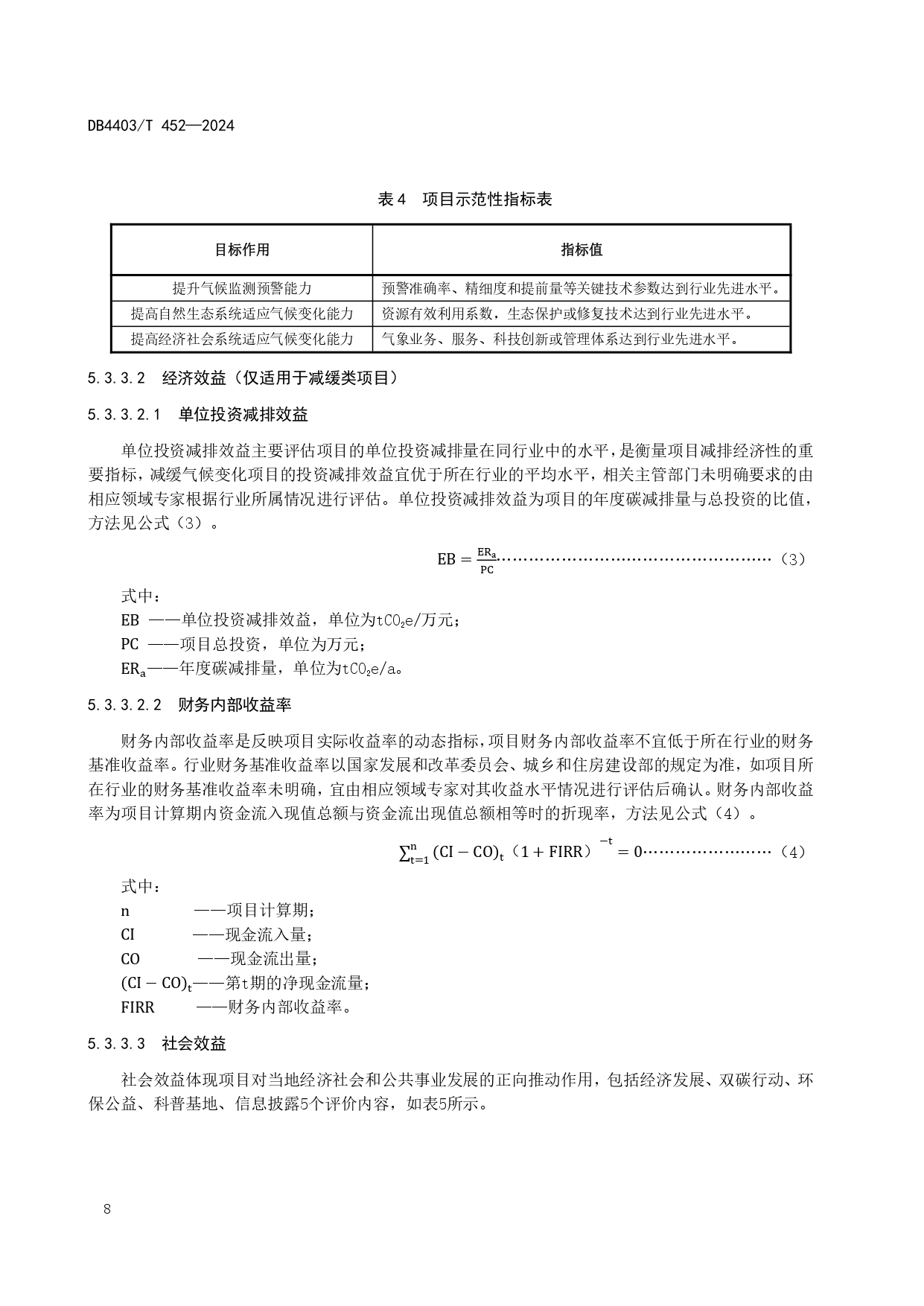 綜合評(píng)估指標(biāo)包括氣候效益顯著性、經(jīng)濟(jì)效益、社會(huì)效益及其他環(huán)境效益等四項(xiàng)指標(biāo),其中氣候效益顯著性為必須滿足的約束指標(biāo)要求,通過(guò)年度碳減排量或碳排放強(qiáng)度指標(biāo)進(jìn)行衡量;經(jīng)濟(jì)效益、社會(huì)效益及其他環(huán)境效益為參考指標(biāo),作為氣候投融資開(kāi)發(fā)項(xiàng)目及推廣項(xiàng)目評(píng)估的參考項(xiàng)。其中,經(jīng)濟(jì)效益通過(guò)單位投資減排效益、財(cái)務(wù)內(nèi)部收益率評(píng)估,僅適用于減緩類項(xiàng)目;社會(huì)效益體現(xiàn)項(xiàng)目對(duì)當(dāng)?shù)亟?jīng)濟(jì)社會(huì)和公共事業(yè)發(fā)展的正向推動(dòng)作用,包括經(jīng)濟(jì)發(fā)展、雙碳行動(dòng)、環(huán)保公益、科普基地、信息披露5個(gè)評(píng)估內(nèi)容;其他環(huán)境效益體現(xiàn)環(huán)境目標(biāo)實(shí)現(xiàn)程度,包括節(jié)能節(jié)水、減排降污、資源綜合利用、生態(tài)保護(hù)和其他類5個(gè)評(píng)價(jià)內(nèi)容。