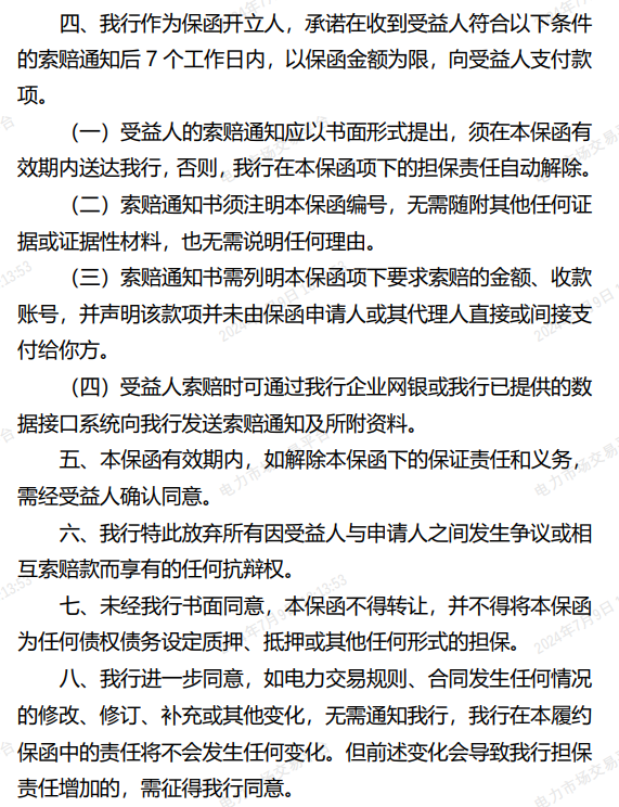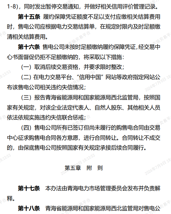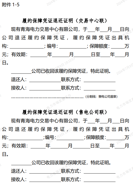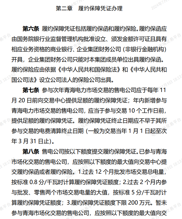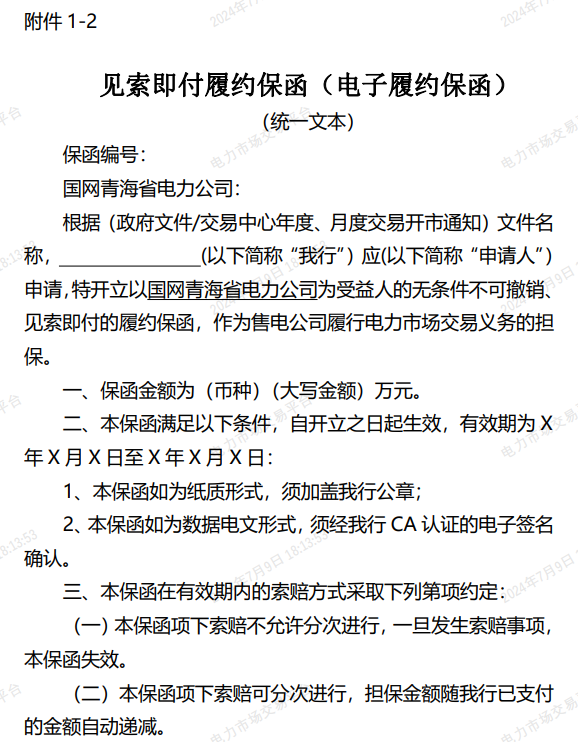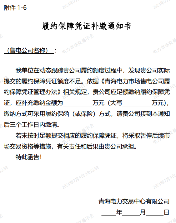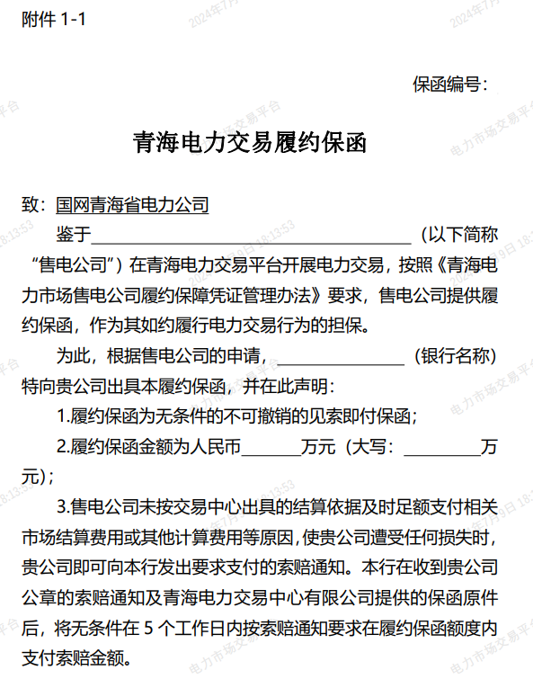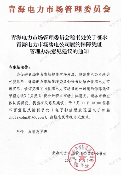 近日,青海電力市場管理委員會秘書處發(fā)布了關(guān)于征求青海電力市場售電公司履約保障憑證管理辦法意見建議的通知,文件提到,參與次年青海電力市場交易的售電公司應(yīng)于每年11月20日前向交易中心提供足額的履約保障憑證;年內(nèi)新增參與青海電力市場交易的售電公司,應(yīng)當(dāng)于參與交易10個工作日前,提供足額的履約保障憑證。履約保障憑證終止日期應(yīng)不早于其所參與交易的電費清算終止日期(一般為交易當(dāng)年1月1日起至次年3月31日止)。