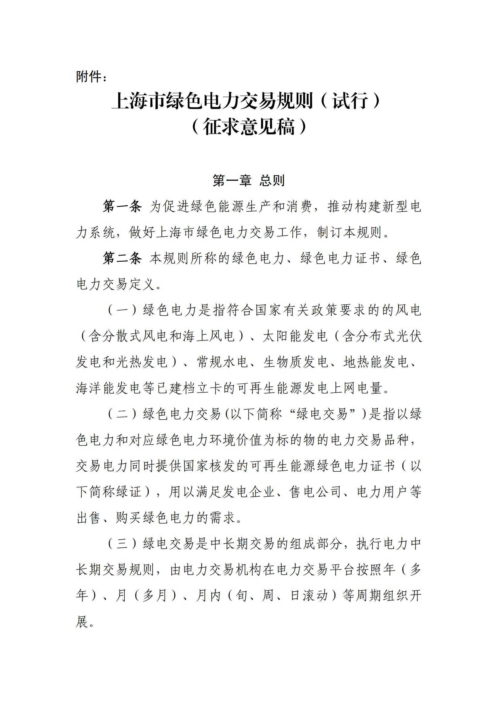 為促進(jìn)綠色能源生產(chǎn)和消費(fèi),推動(dòng)構(gòu)建新型電力系統(tǒng),做好上海市綠色電力交易工作,我局結(jié)合上海實(shí)際起草了《上海市綠色電力交易規(guī)則(試行)》(征求意見(jiàn)稿),現(xiàn)向社會(huì)公開(kāi)征求意見(jiàn)。