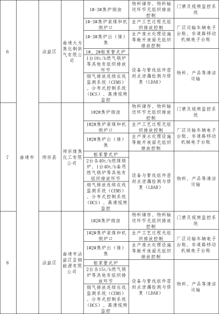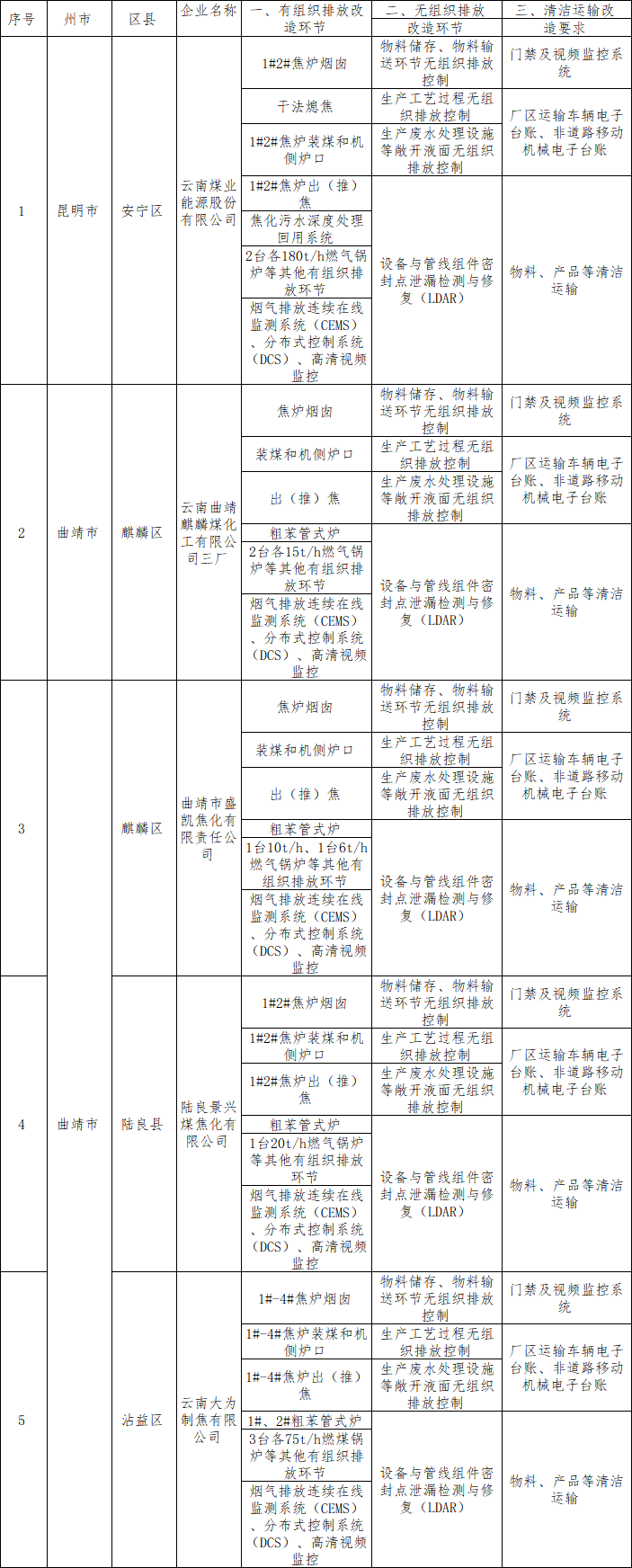 云南省焦化企業(yè)超低排放改造任務(wù)清單
