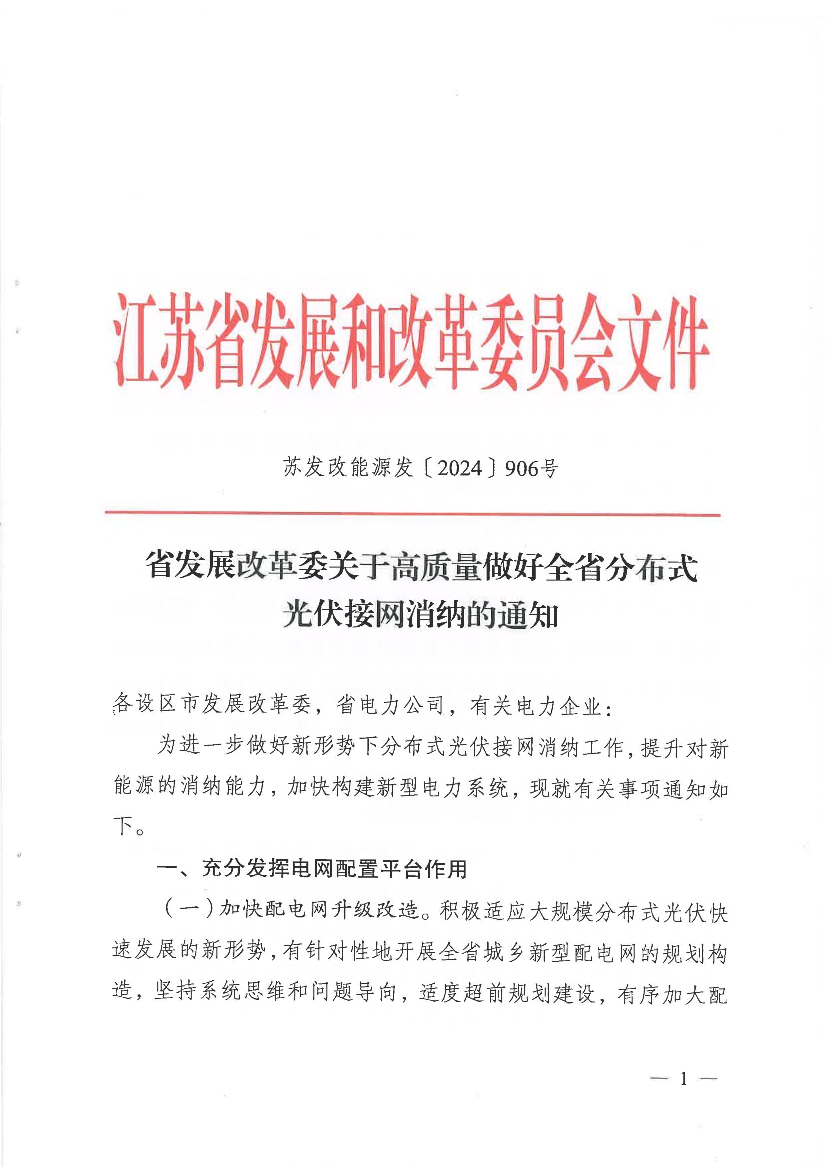 8月12日,江蘇省發(fā)展改革委印發(fā)《關(guān)于高質(zhì)量做好全省分布式光伏接網(wǎng)消納的通知》(蘇發(fā)改能源發(fā)〔2024〕906號(hào),以下簡(jiǎn)稱《通知》)。