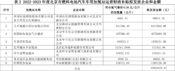 2022-2023年度北京市燃料電池汽車車用加氫站建設(shè)和運(yùn)營財(cái)政補(bǔ)貼情況公示