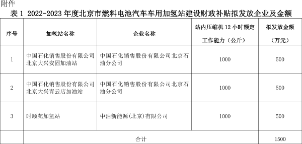 10月15日,北京市城市管理委員會發(fā)布2022-2023年度北京市燃料電池汽車車用加氫站建設(shè)和運(yùn)營財(cái)政補(bǔ)貼情況公示。根據(jù)公示顯示,2022-2023年度北京市燃料電池汽車車用加氫站建設(shè)財(cái)政補(bǔ)貼擬發(fā)放企業(yè)為中國石化銷售股份有限公司北京石油分公司、中油新能源(北京)有限公司,兩家企業(yè)共建設(shè)站內(nèi)壓縮機(jī)12小時額定工作能力為1000公斤的加氫站3坐,補(bǔ)貼金額共1500萬元。