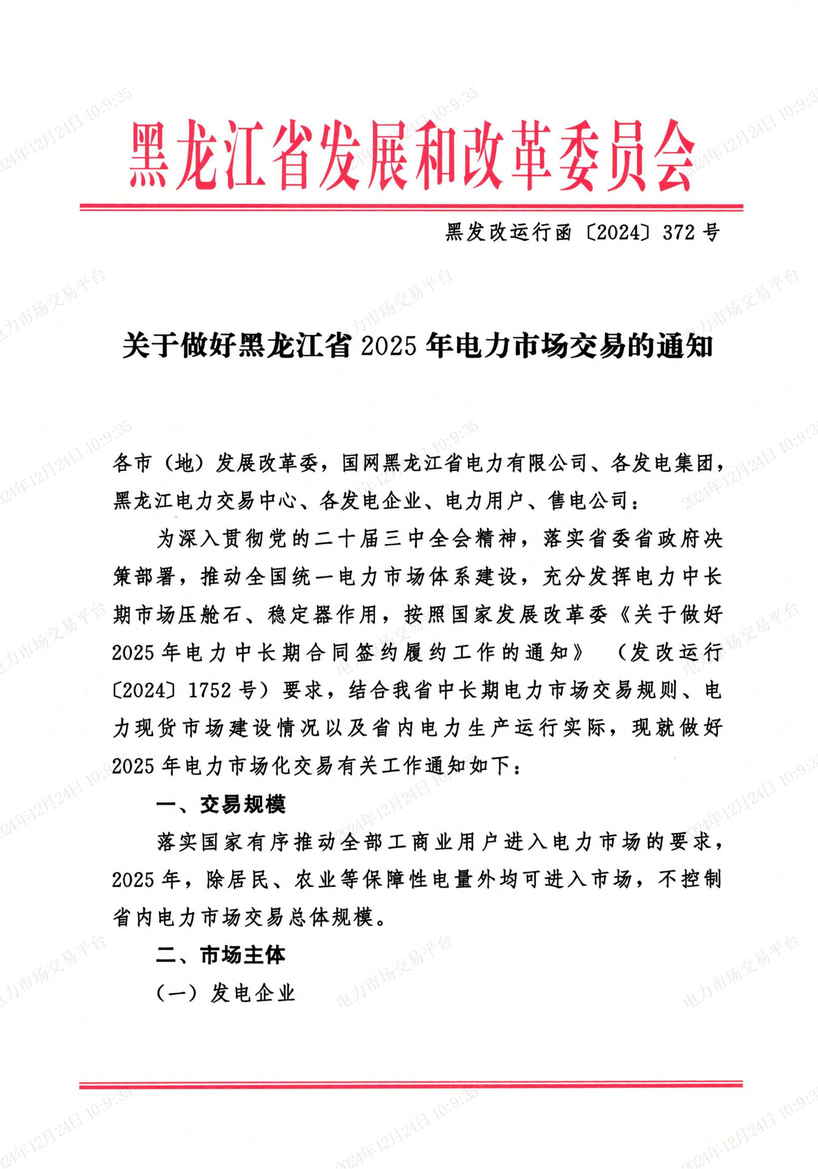 近日,黑龍江省發(fā)展和改革委員會發(fā)布關(guān)于做好黑龍江省2025年電力市場交易的通知,文件提到,落實(shí)國家有序推動全部工商業(yè)用戶進(jìn)入電力市場的要求,2025年,除居民、農(nóng)業(yè)等保障性電量外均可進(jìn)入市場,不控制省內(nèi)電力市場交易總體規(guī)模。