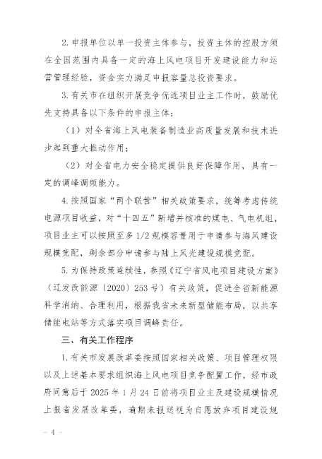 《通知》還指出,項(xiàng)目業(yè)主應(yīng)注重規(guī)?;_發(fā),至少開發(fā)建設(shè)50萬千瓦以上規(guī)模海上風(fēng)電項(xiàng)目。注意集約利用海洋資源,優(yōu)化海底送出通道布置。除大連市DL2、DL3項(xiàng)目可以采取單條海底送出通道外,其他區(qū)域每條海底送出通道容量不得低于50萬千瓦。《通知》明確,有關(guān)市發(fā)展改革委按照國家相關(guān)政策、項(xiàng)目管理權(quán)限以及上述基本要求組織海上風(fēng)電項(xiàng)目競爭配置工作,經(jīng)市政府同意后于2025年1月24日前將項(xiàng)目業(yè)主及建設(shè)規(guī)模情況上報(bào)省發(fā)展改革委,逾期未報(bào)送視為自愿放棄項(xiàng)目建設(shè)規(guī)模。