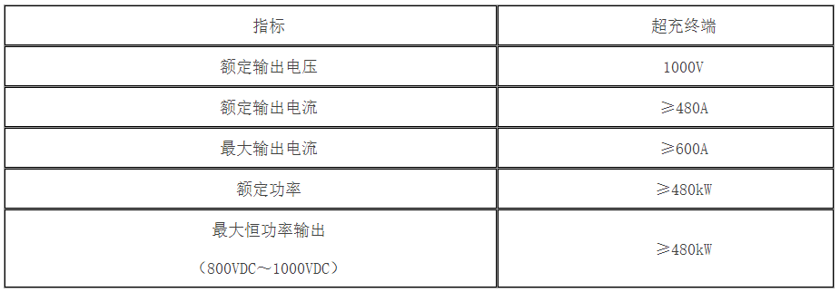 至少配置一個(gè)車輛插頭,其單槍輸出電壓1000V,最大輸出電流不少于600A,800VDC~1000VDC范圍最大恒功率輸出不少于480kW,詳見表1。