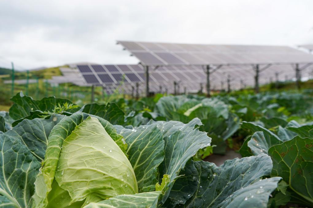 6月24日,貴州省威寧縣雙龍鎮(zhèn)高山村的仙水窩農(nóng)業(yè)光伏電站,光伏板下種植的蔬菜青翠欲滴。