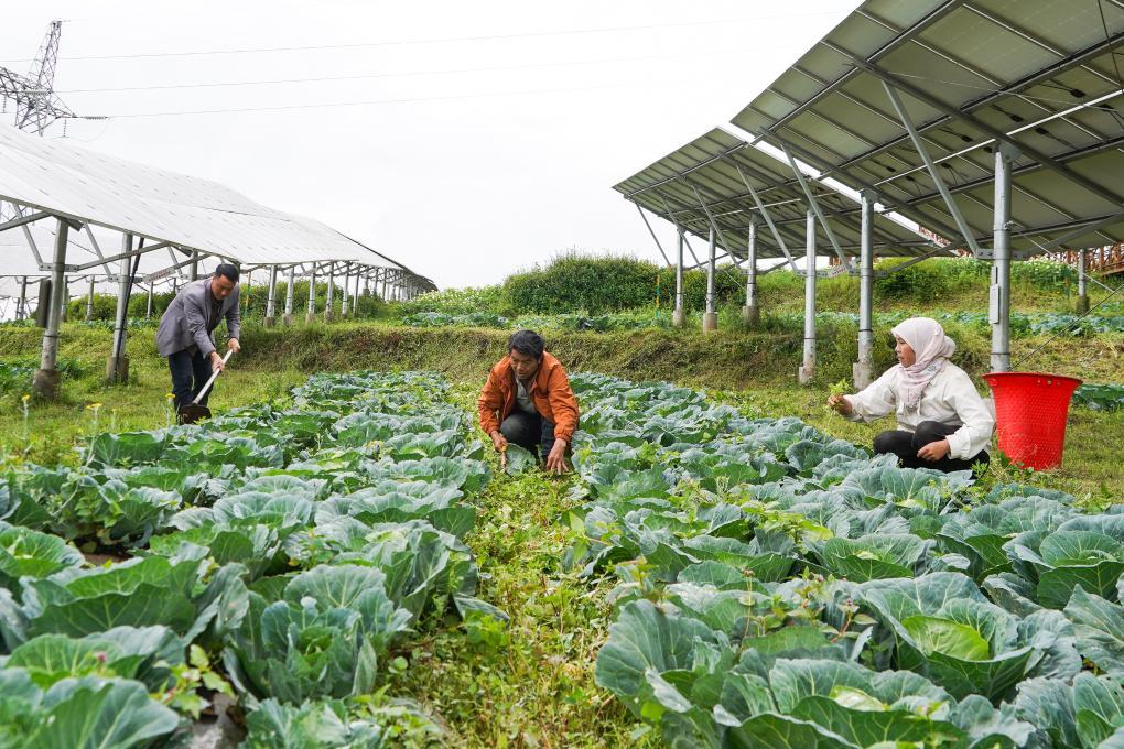 6月24日,貴州省威寧縣雙龍鎮(zhèn)高山村的仙水窩農(nóng)業(yè)光伏電站,務(wù)工群眾在對(duì)光伏板下的蔬菜進(jìn)行管護(hù)。