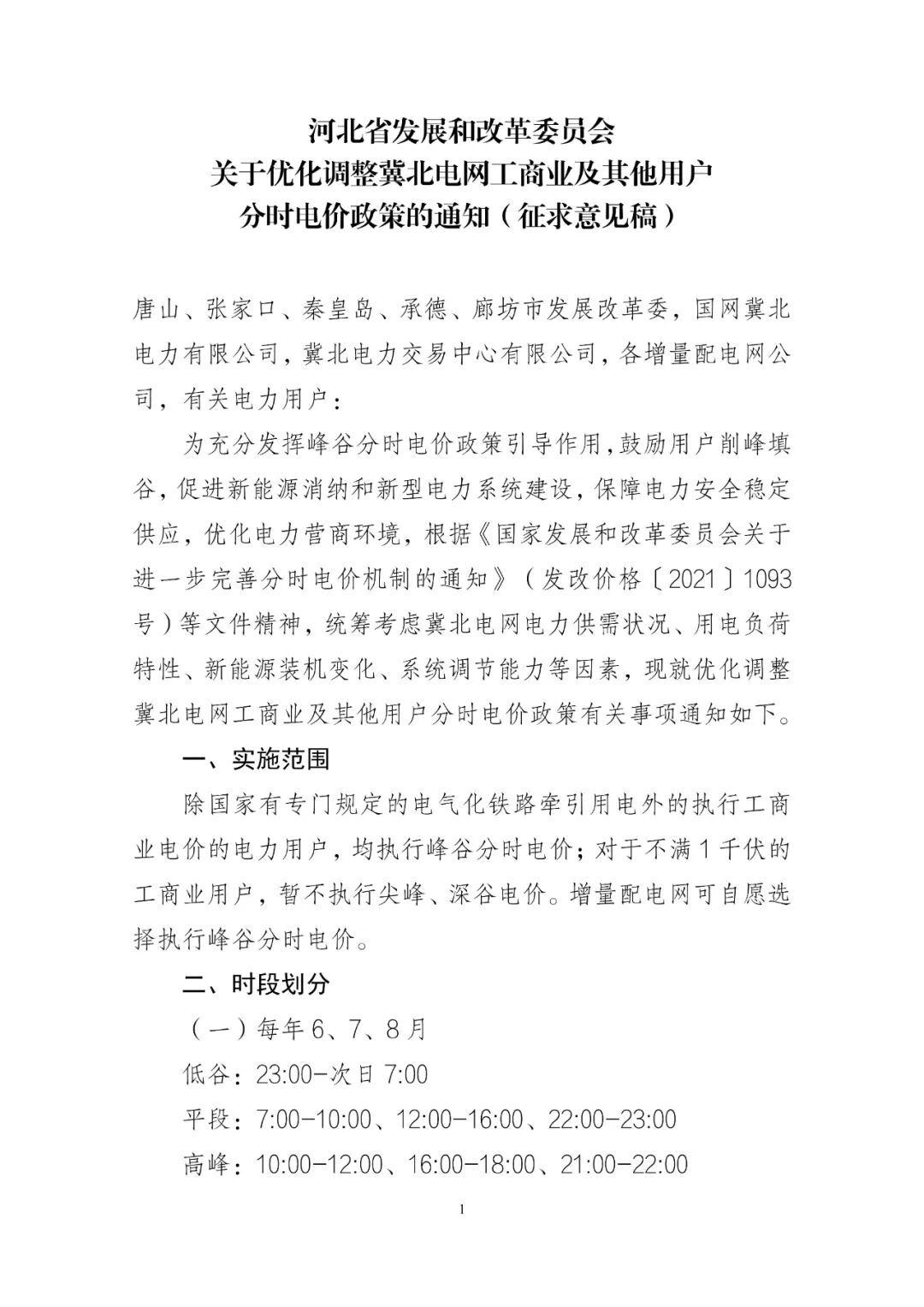 關(guān)于公開征求《關(guān)于優(yōu)化調(diào)整冀北電網(wǎng)工商業(yè)及其他用戶分時電價政策的通知(征求意見稿)》意見的公告