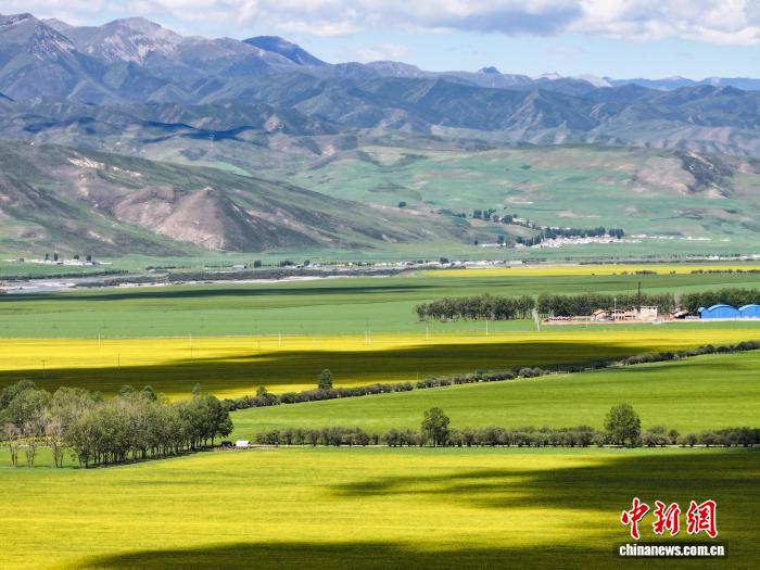 資料圖為航拍2024年7月1日,地處祁連山腹地的青海省門源回族自治縣大片油菜花盛開。馬銘言攝