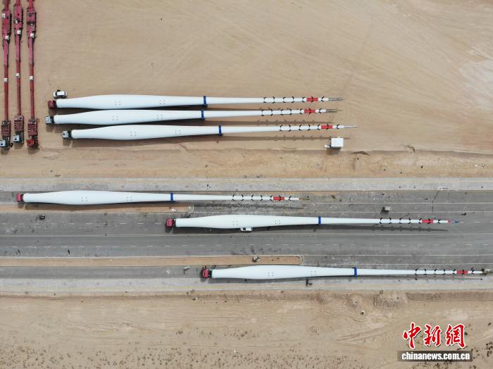 4月23日,航拍位于甘肅省武威市民勤縣的甘肅遠景能源有限公司運輸完成制造的智能風(fēng)機葉片。李亞龍攝