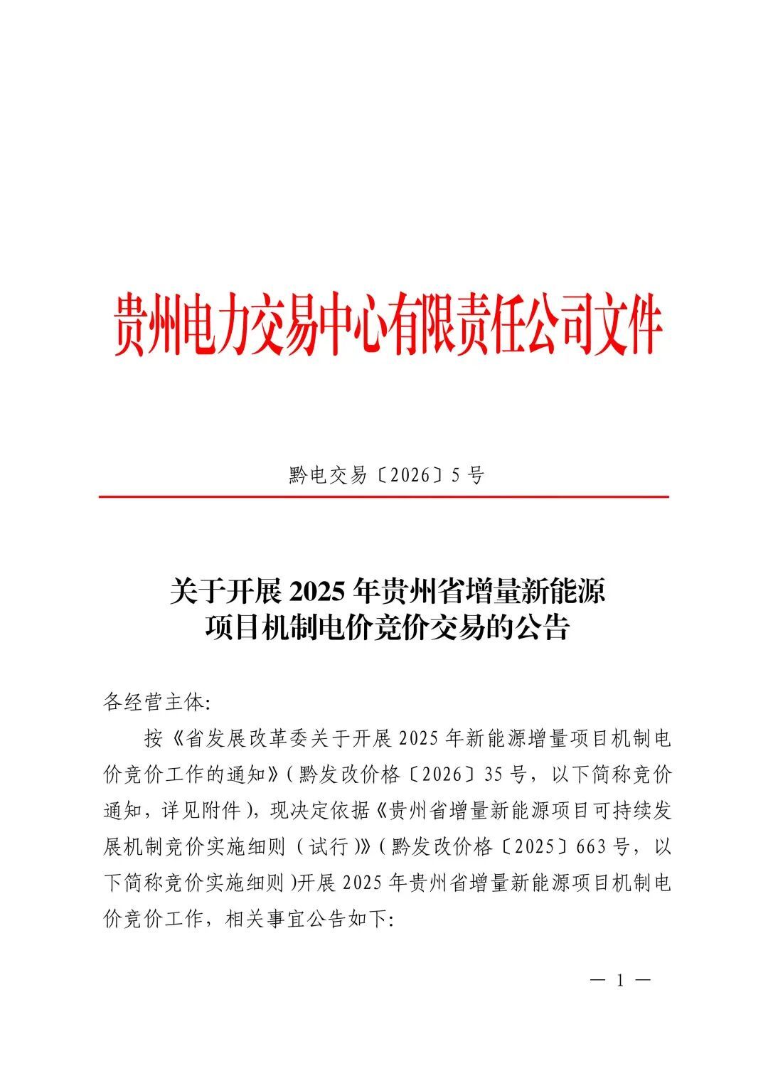 1月21日,貴州電力交易中心發(fā)布《關(guān)于開展2025年新能源增量項(xiàng)目機(jī)制電價(jià)競價(jià)工作的通知》。