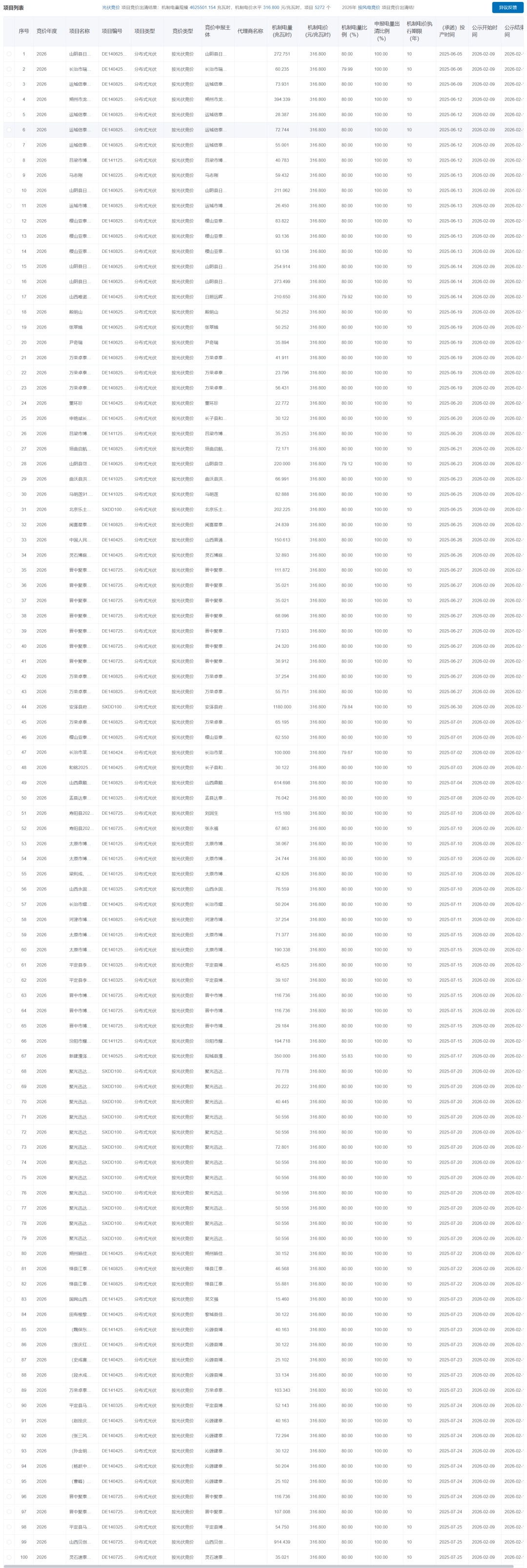 按光伏競價項目競價出清結果:機制電量規(guī)模4625501.154兆瓦時,機制電價水平316.800元/兆瓦時,項目5272個