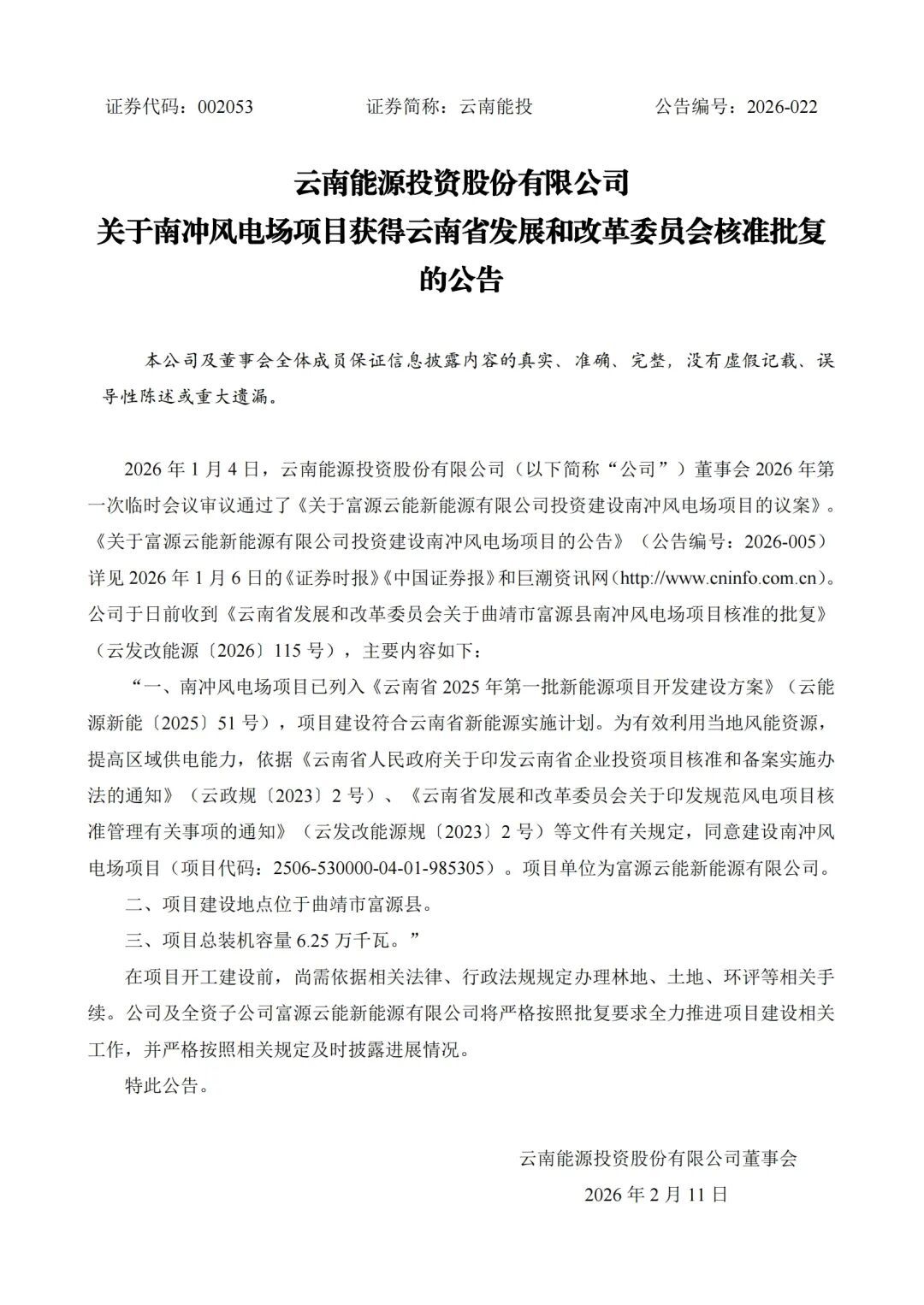 云南能投2月10日發(fā)布公告,南沖風(fēng)電場項(xiàng)目已列入《云南省2025年第一批新能源項(xiàng)目開發(fā)建設(shè)方案》,項(xiàng)目總裝機(jī)容量6.25萬千瓦,建設(shè)地點(diǎn)位于曲靖市富源縣。項(xiàng)目建設(shè)符合云南省新能源實(shí)施計(jì)劃。