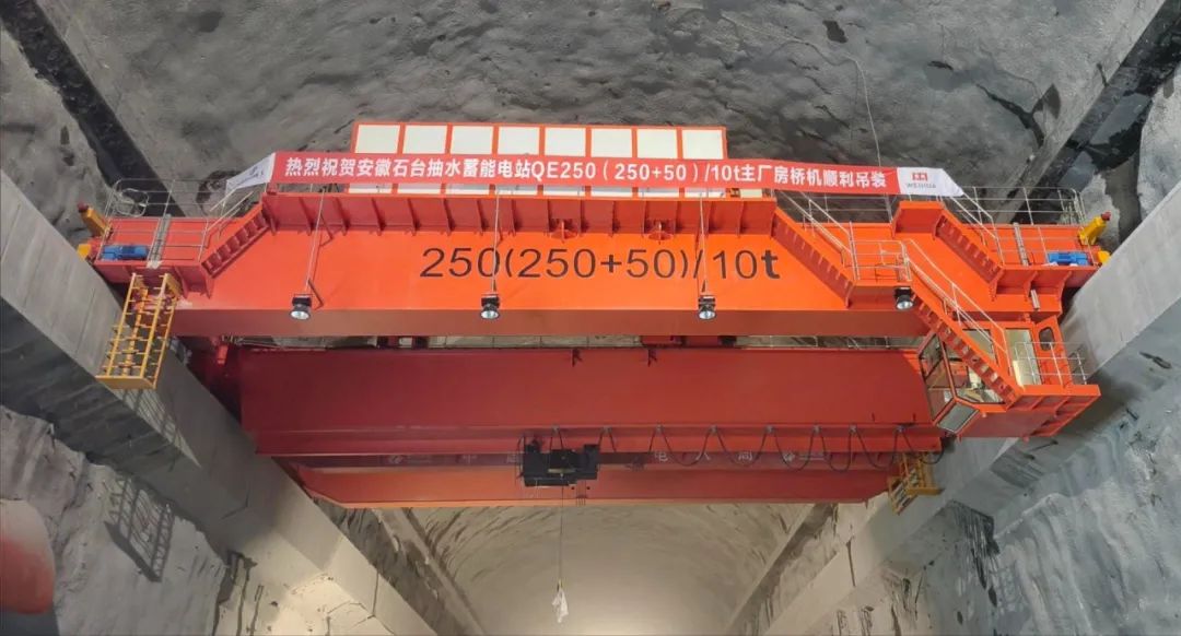 2025年4月16日,安徽石臺(tái)抽水蓄能電站主廠房首臺(tái)250噸橋機(jī)完成吊裝,為電站機(jī)組埋件安裝奠定了堅(jiān)實(shí)基礎(chǔ)。