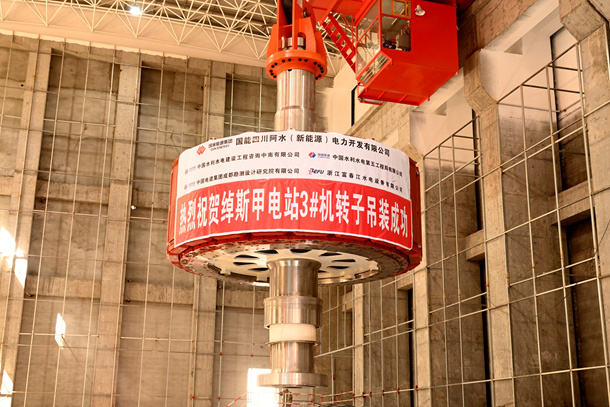 圖為綽斯甲水電站3號(hào)轉(zhuǎn)子吊裝現(xiàn)場(chǎng)