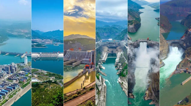 世界最大清潔能源走廊六座梯級電站(從左至右依次為:葛洲壩電站、三峽電站、向家壩電站、溪洛渡電站、白鶴灘電站、烏東德電站)資料圖片