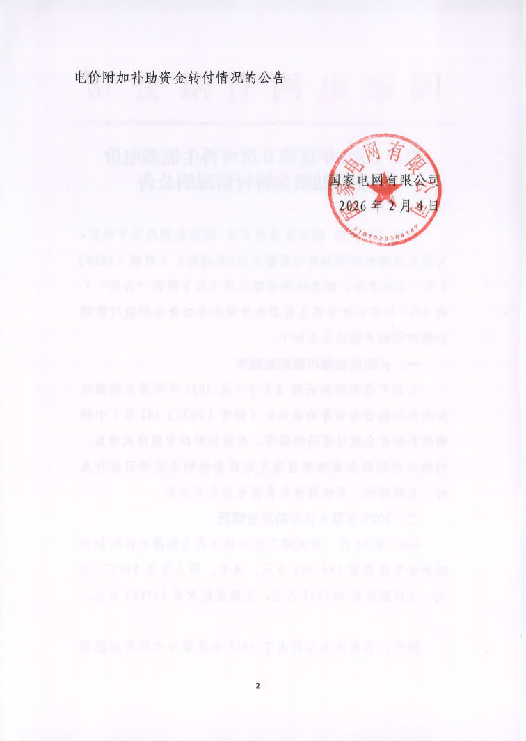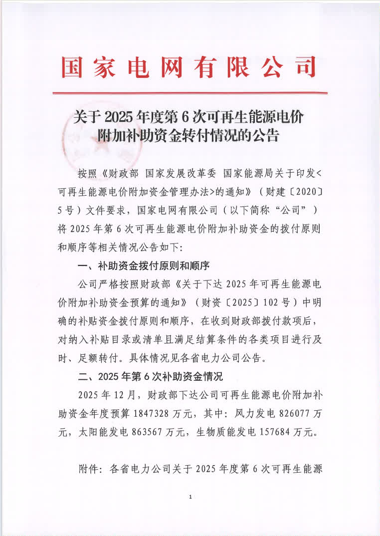 2月24日,國家電網(wǎng)有限公司發(fā)布了關(guān)于2025年度第6次可再生能源電價(jià)附加補(bǔ)助資金轉(zhuǎn)付情況的公告。