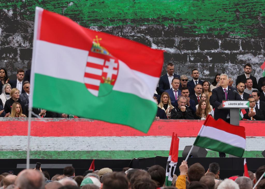 2025年10月23日,匈牙利總理歐爾班(前右)在首都布達(dá)佩斯舉行的一場集會上講話。新華社發(fā)(弗爾季·奧蒂洛攝)