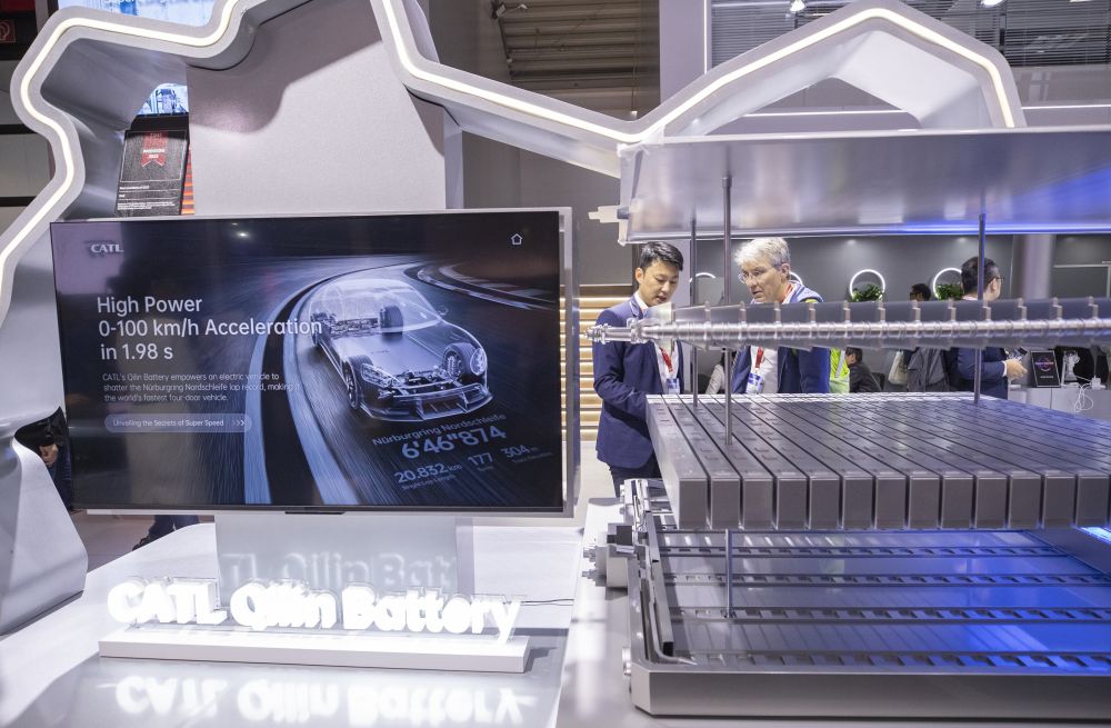 2025年9月10日,人們?cè)诘聡?guó)慕尼黑國(guó)際車展的寧德時(shí)代展臺(tái)洽談。(張帆攝)