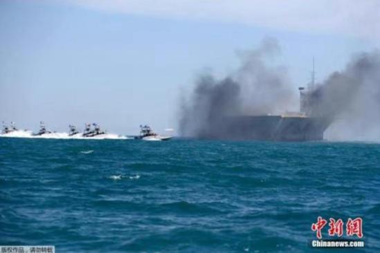 資料圖:當(dāng)?shù)貢r(shí)間2015年2月25日,伊朗南部霍爾木茲海峽,伊朗伊斯蘭革命衛(wèi)隊(duì)于霍爾木茲海峽舉行軍事演習(xí)。