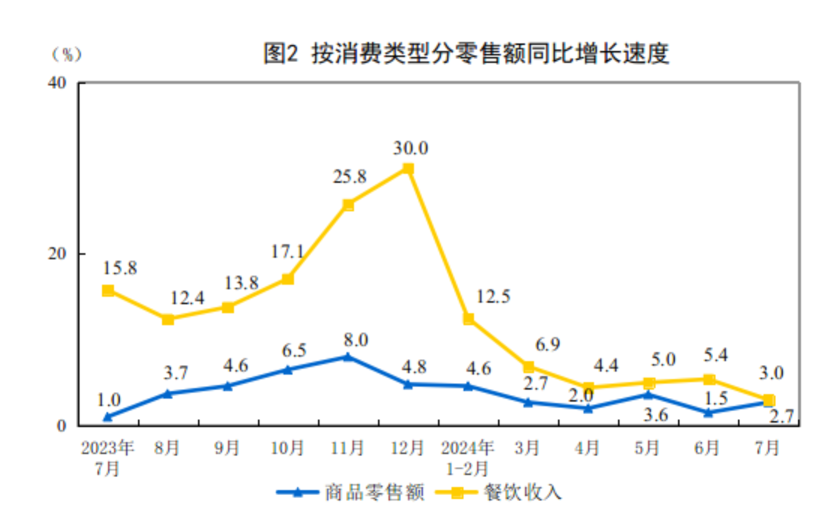 按消費類型分,7月份,商品零售額33354億元,同比增長2.7%;餐飲收入4403億元,增長3.0%。1—7月份,商品零售額243079億元,增長3.1%;餐飲收入30647億元,增長7.1%。