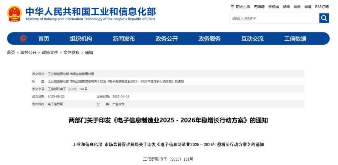 工業(yè)和信息化部 市場(chǎng)監(jiān)督管理總局關(guān)于印發(fā)《電子信息制造業(yè)2025-2026年穩(wěn)增長(zhǎng)行動(dòng)方案》的通知