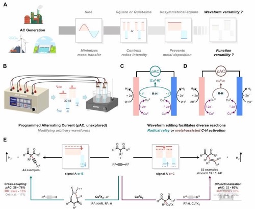 雷愛文團隊耕耘綠色合成化學(xué)超過15年,該項研究首創(chuàng)開發(fā)了可編程波形交流電(pAC)合成技術(shù),實現(xiàn)了銅催化的放氫氣氧化交叉偶聯(lián)反應(yīng)。通過對交流電波形的電學(xué)參數(shù)(頻率、電流和占空比)進行程序編輯,可得到定制化交流電信號。