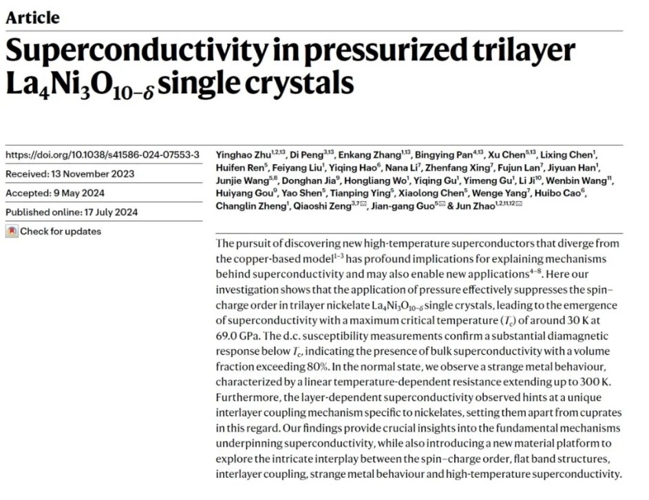 超導體因巨大應用潛力備受關注,尋找新型高溫超導體是科學界孜孜以求的目標。復旦大學物理學系趙俊團隊利用高壓光學浮區(qū)技術,成功生長了三層鎳氧化物La4Ni3O10高質量單晶樣品,證實了鎳氧化物中具有壓力誘導的體超導電性,其超導體積分數(shù)達到86%,這意味著又一新型高溫超導體被發(fā)現(xiàn)。該項研究成果于北京時間7月17日晚發(fā)表于最新一期《自然》。
