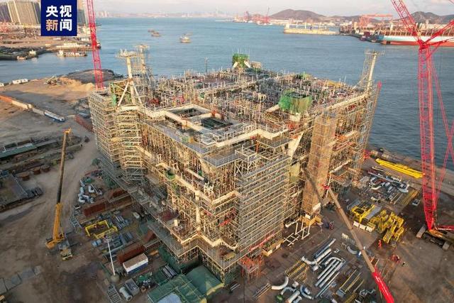 在山東青島國(guó)際化高端裝備制造基地,一個(gè)重達(dá)17000多噸“巨無霸”,是目前在建國(guó)際上最大的油氣集輸平臺(tái)。經(jīng)過34個(gè)月的施工建造,今天正式交付,月底將搭乘大型運(yùn)輸船,啟程前往6400海里以外的海域進(jìn)行安裝。