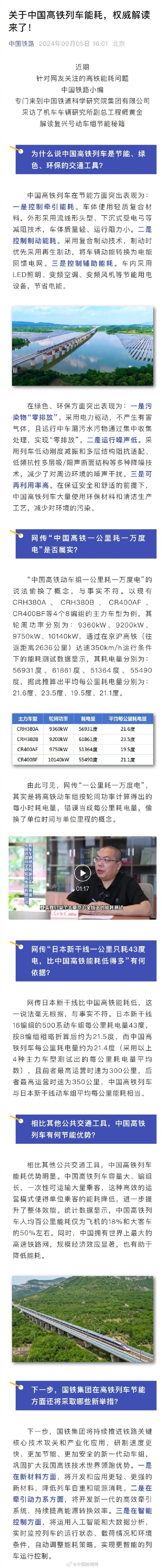 近期,針對網(wǎng)友關(guān)注的高鐵能耗問題,中國鐵路小編采訪中國鐵道科學(xué)研究院集團有限公司機車車輛研究所副總工程師黃金,“中國高鐵動車組一公里耗一萬度電”的說法偷換了概念,與事實不符。以現(xiàn)有CRH380A、CRH380B、CR400AF、CR400BF等4個8編組的主力車型為例,其輪周功率分別為:9360kW、9200kW、9750kW、10140kW,通過在京滬高鐵(往返距離2636公里)達速350km/h運行條件下的能耗測試數(shù)據(jù)顯示,其耗電量分別為:56931度、61861度、51364度、55490度,據(jù)此推算出平均每公里耗電量分別為:21.6度、23.5度、19.5度、21.1度。由此可見,網(wǎng)傳“一公里耗一萬度電”,其實是將高鐵動車組按輪周功率計算得出的每小時耗電量,錯誤當(dāng)成每公里耗電量,偷換了單位時間與單位里程的概念。