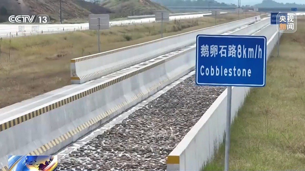 總臺(tái)央視記者 李偉代:這段鵝卵石路,又叫異響路,它是專門用來測(cè)試汽車發(fā)出的異常的聲響。這段路的兩邊還特意設(shè)置了兩面墻。