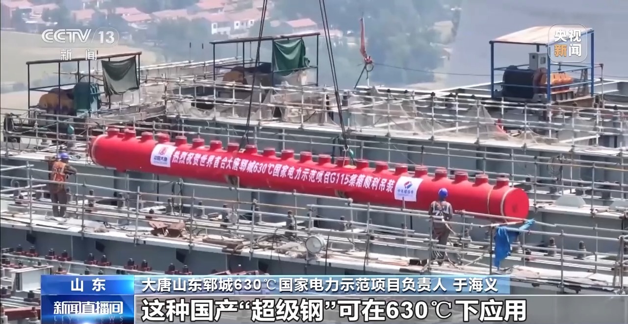 大唐山東鄆城630℃國(guó)家電力示范項(xiàng)目負(fù)責(zé)人 于海義:這種國(guó)產(chǎn)“超級(jí)鋼”可在630℃下應(yīng)用,就像給電廠(chǎng)換裝成更強(qiáng)大的“血管”,它的強(qiáng)度、抗氧化能力比進(jìn)口鋼材大大提高,可以使管道壁厚減少三分之一,重量減輕一半,助力煤電機(jī)組熱效率突破50%大關(guān)。