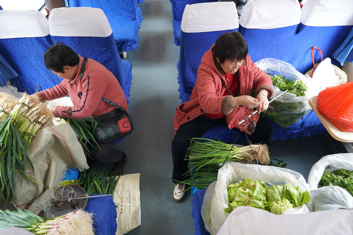 2月17日,兩名乘客在6064次列車上整理蔬菜。新華社記者邵瑞 攝