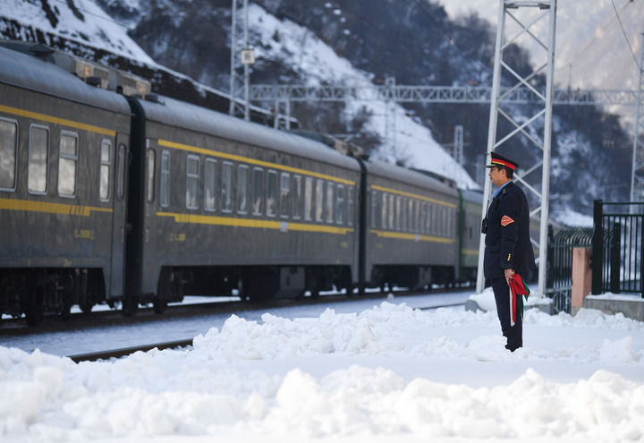 1月28日,在寶成鐵路秦嶺觀音山車站,工作人員在站臺引導(dǎo)列車通行。新華社記者張博文 攝