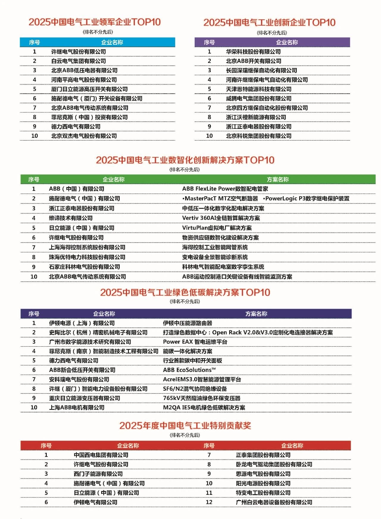 會(huì)上,機(jī)械工業(yè)信息研究院電氣時(shí)代雜志社社長(zhǎng)田付新正式發(fā)布100強(qiáng)企業(yè)名單并頒獎(jiǎng)。同期揭曉的還有“2025中國(guó)電氣工業(yè)領(lǐng)軍企業(yè)TOP10”“2025中國(guó)電氣工業(yè)創(chuàng)新企業(yè)TOP10”“2025中國(guó)電氣工業(yè)數(shù)智化創(chuàng)新解決方案TOP10”“2025中國(guó)電氣工業(yè)綠色低碳解決方案TOP10”四大專(zhuān)項(xiàng)榜單。