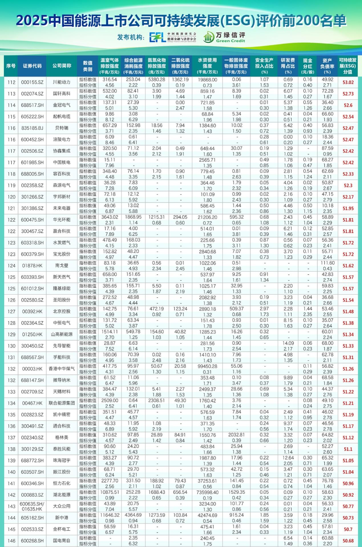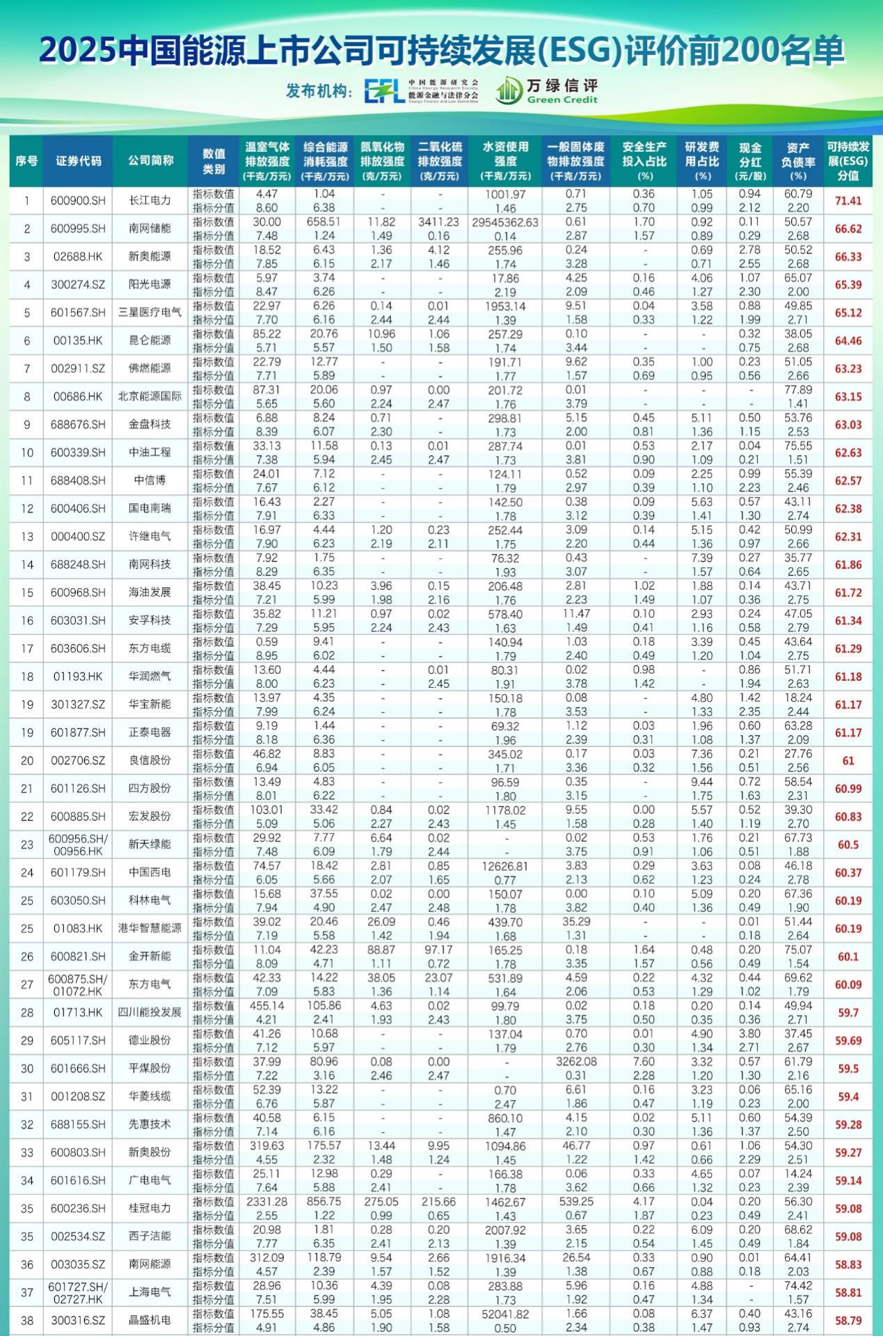 為推動標(biāo)準(zhǔn)實踐應(yīng)用,中國能源研究會能源金融與法律分會聯(lián)合專業(yè)評級機構(gòu),對境內(nèi)632家能源領(lǐng)域上市公司進行了可持續(xù)發(fā)展(ESG)評價,并于2025年9月發(fā)布了《2025中國能源上市公司可持續(xù)發(fā)展(ESG)評價報告》及前200強名單(見附件)。長江電力、新奧能源、陽光電源等27家公司獲評最高“A”級。