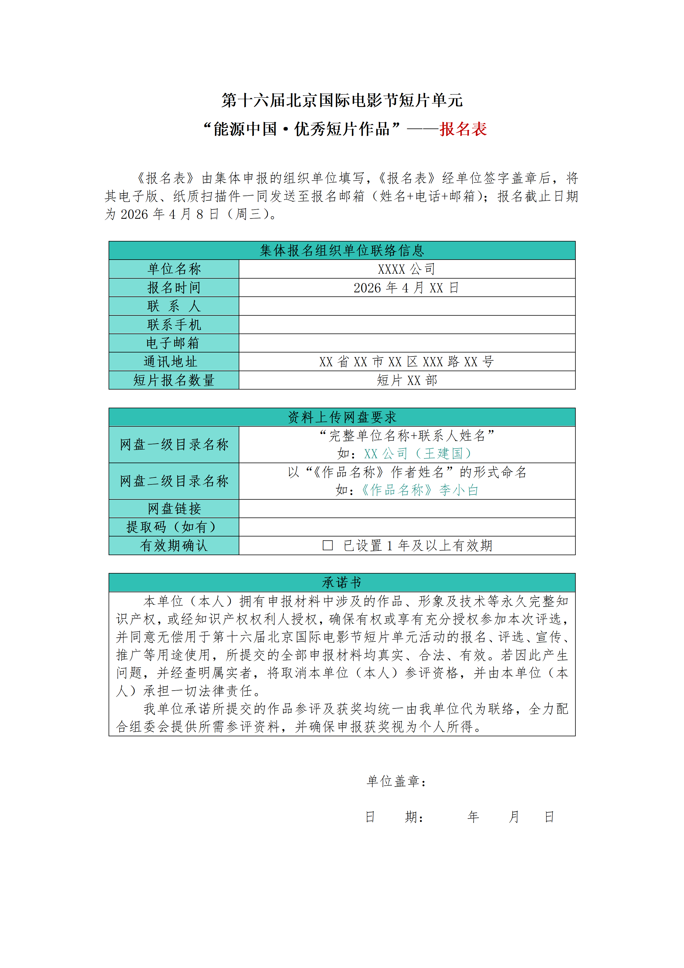 4. 報名材料:填寫《報名表》(見文末),加蓋單位公章,將作品上傳至網(wǎng)盤,將下載鏈接與提取碼填入報名表中。將《報名表》電子版及蓋章掃描件發(fā)送至報名郵箱(見文末),郵件主題命名為“單位名稱+聯(lián)系人姓名+2026短片征集”。