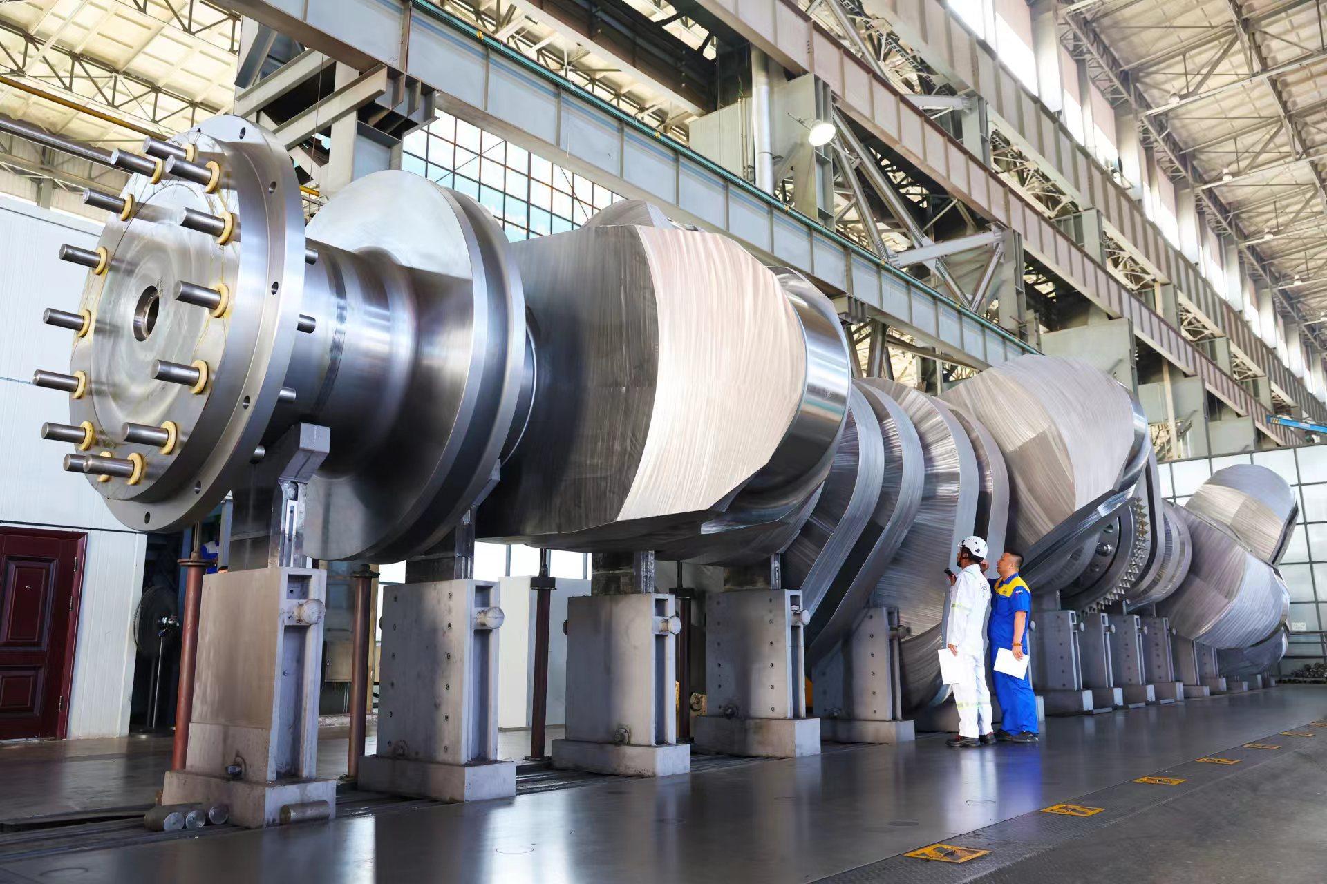 世界首支、全球最大24000TEU甲醇雙燃料動(dòng)力集裝箱船用曲軸12G95ME-C10.5成功下線。李秀譜攝