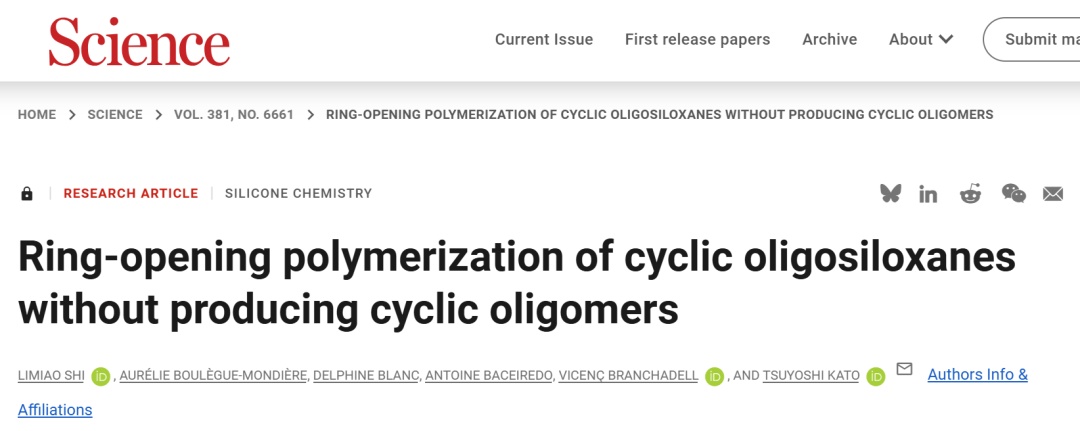 此前,??嫌袡C(jī)硅法國研發(fā)團(tuán)隊和其合作伙伴還突破性地解決了聚合反應(yīng)中環(huán)體低聚物污染有機(jī)硅聚合物的行業(yè)難題。這一成果可消除特殊應(yīng)用中低環(huán)體物質(zhì)的毒性影響,進(jìn)而生產(chǎn)更高品質(zhì)的有機(jī)硅產(chǎn)品,相關(guān)成果已于2023年9月1日發(fā)表在《科學(xué)》(Science)雜志上。