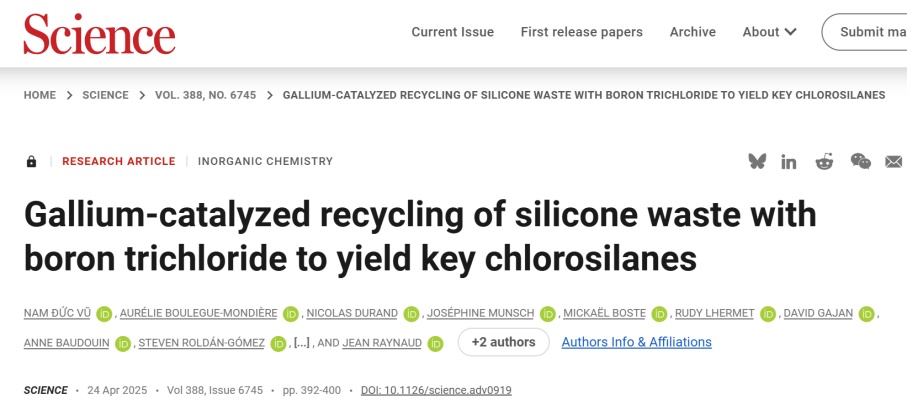 有機(jī)硅材料因其優(yōu)異的機(jī)械性能、熱穩(wěn)定性、化學(xué)耐受性和低毒性,廣泛應(yīng)用于日常生活、汽車制造、電子電器、醫(yī)療保健和航空等多個領(lǐng)域。據(jù)統(tǒng)計,2024年全球有機(jī)硅消費(fèi)量(以硅氧烷計)約為310萬噸,市場價值約400億美元。然而,有機(jī)硅生產(chǎn)過程能耗高且會排放大量二氧化碳;此外,有機(jī)硅廢棄物的處理方式目前主要是焚燒或填埋,這不僅浪費(fèi)資源,還對環(huán)境造成很大影響。